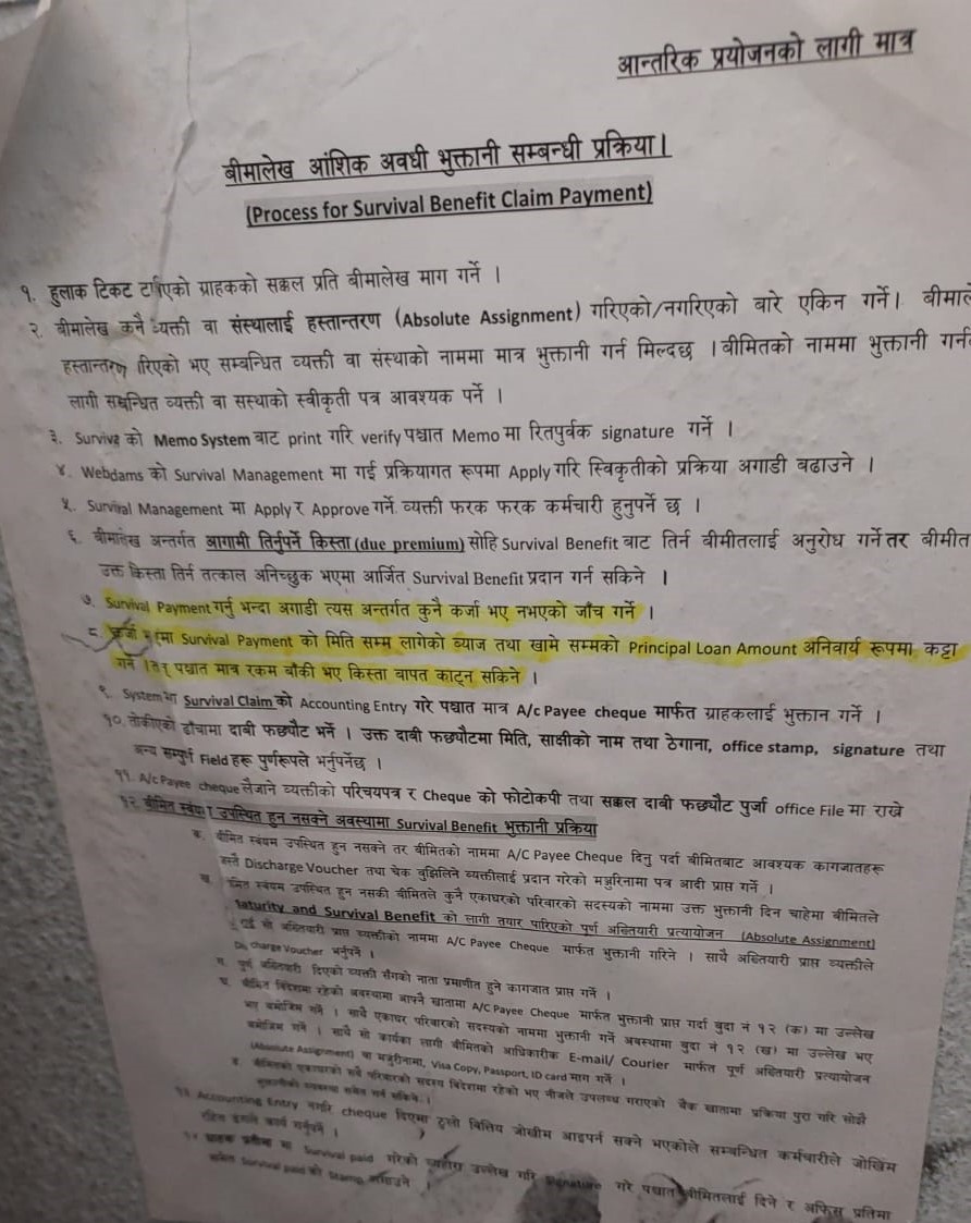 बीमा ऐन २०७९, बीमा नियमावली २०४९, जीवन बीमालेख निर्देशिका २०७८ र नेपाल लाईफले जारी गरेकाे बीमालेखकाे शर्तहरुमा समेत उल्लेख नभएकाे शर्त तेर्स्याएर अग्रिम भुक्तानीवापत बीमितले प्राप्त गर्ने रकम भुक्तानी लिन आउँदा कुनै कर्जा रकम लिएकाे छ भने साेकाे ब्याज र साँवा समेत चुक्ता भएपछि बाँकी रहने रकम मात्र भुक्तानी गर्न थालेकाे हाे । बीमितलाई कर्जाकाे साँवा र ब्याज रकम भुक्तानीका लागी बाध्य पार्नकाे लागी कम्पनीकाे उच्च व्यवस्थापनले अनधिकृतरुपमा आन्तरिक निर्देशन नै जारी गरेकाे छ ।