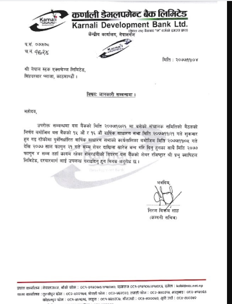 साधारण सभा प्रयोजनको लागि शेयरधनीदर्ता पुस्तिका फागुन ५ गतेदेखि २१ गतेसम्म बन्द रहने छ । फागुन ४ गतेसम्म कायम शेयरधनीले साधारण सभामा भाग लिन सक्नेछन् ।
