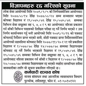 कोषले विज्ञापन न.१९/०७५/७६ देखि २५/०७५/७६ सम्मका विभिन्न सेवा समुहका तह ६/७/८ र ९ का आयोगबाट नतिजा प्रकाशन गर्न बाँकी विभिन्न पदहरुको लिखित परिक्षा रद्ध गर्ने निर्णय गरेको छ । साथै ०७७/११/२० र २१ गते प्रकाशित विज्ञापन न.१/०७७/७८ देखि २४/०७७/७८ सम्मका विज्ञापनहरु कोषबाट रद्ध गर्ने निर्णय भएकोले कोषले जनाएको छ ।