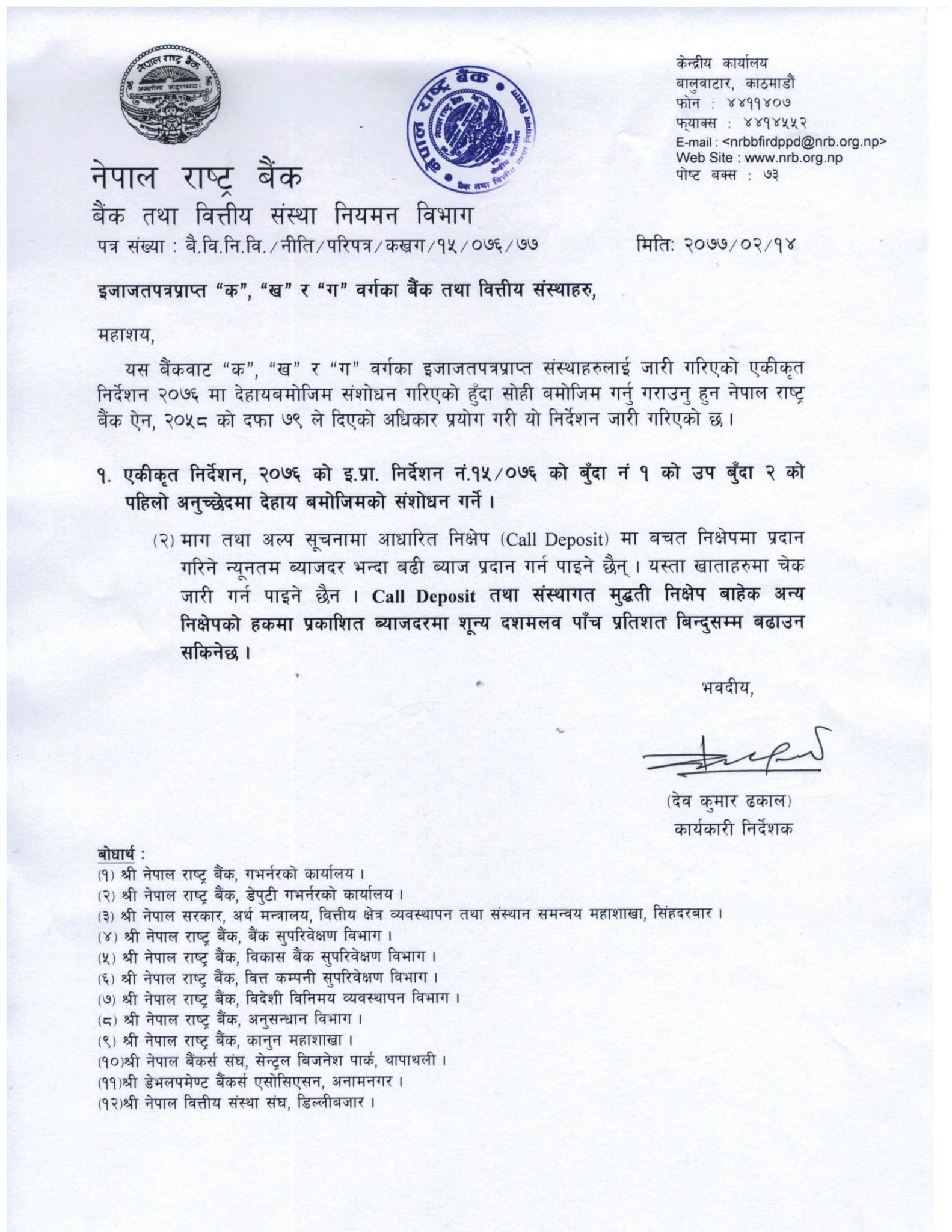 बैंकले परिपत्र जारी गर्दै “माग तथा अल्प सुचनामा आधारित निक्षेप(कल डिपोजिट) मा बचत निक्षेपमा प्रदान गरिने न्युनतम व्याजदर भन्दा बढी व्याज प्रदान गर्न पाईने छैन । साथै, राष्ट्र बैंकले खाताहरुमा चेक जारी समेत गर्न नपाईने जनाइएको छ ।