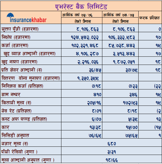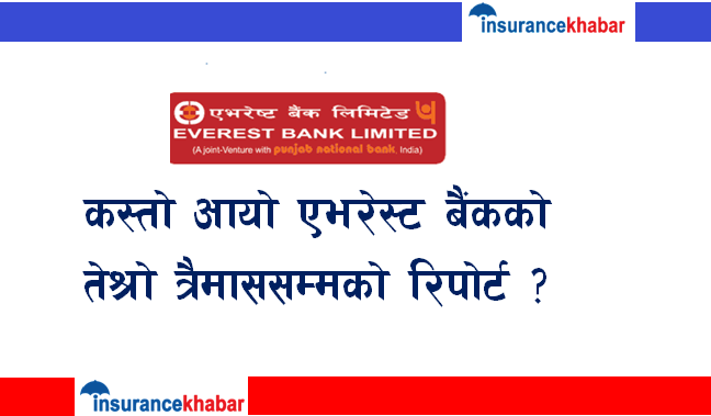 एभरेस्ट बैंकले चालु आर्थिक वर्षको तेश्रो त्रैमासको वित्तिय विवरण सार्वजनिक गरेको छ। कम्पनीले आर्थिक वर्ष ७५/७६ मा २ अर्ब २१ करोड खुद नाफा गरेको छ। कम्पनीले गत आर्थिक वर्ष ७४/७५ को तेश्रो त्रैमासमा १ अर्ब ८७ करोड खुद नाफा कमाएको छ। कम्पनीको खुद नाफा १८ प्रतिशतले वृद्धि भएको छ।