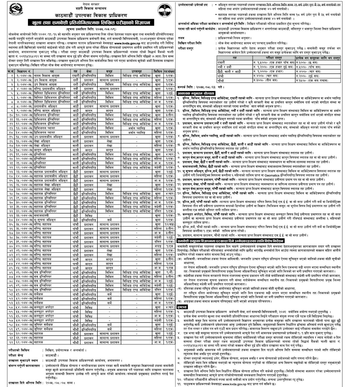 काठमाडौँ उपत्यका विकास प्राधिकरणले विभिन्न पदका लागि कर्मचारीको माग गरेको छ । प्राधिकरणले खुल्ला तथा समावेशी प्रतियोगितात्मक लिखित परीक्षाको लागि विज्ञापन आहवान गरेको छ ।