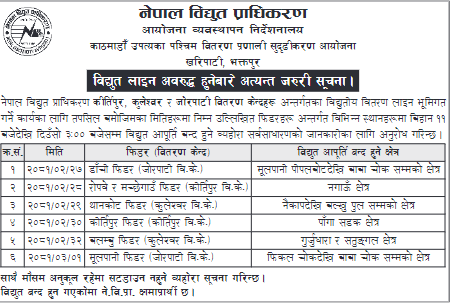 काठमाडौं । काठमाडौंको कीर्तिपुर, कुलेश्वर, जोरपाटी वितरण केन्द्रहरु अन्तर्गतका विद्युत् सेवा एक सातासम्म अवरुद्ध हुने भएको छ । विद्युत् वितरण लाइन भुमिगत गर्ने भएकाले आइतबारदेखि शुक्रबारसम्म यी स्थानमा विद्युत् सेवा अवरुद्ध हुने भएको हो। यी फिडरहरू अन्तर्गत विभिन्न स्थानहरूमा बिहान ११ बजेदेखि दिउँसो ३ बजेसम्म विद्युत् आपूर्ति बन्द हुने प्राधिकरणले जनाएको छ ।