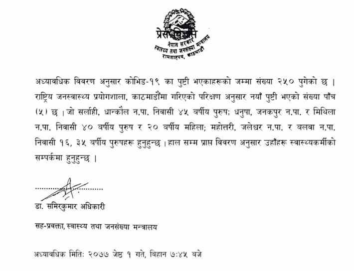 अपडेटः स्वास्थ्य तथा जनसंख्या मन्त्रालयले आज थप भएको भनिएको पाँच जना कोरोना संक्रमितको विवरण सच्याएको छ । पछिल्लो तथ्याङ्क अनुसार २४५ जना मात्रै कोरोनाबाट संक्रमित छन् ।
