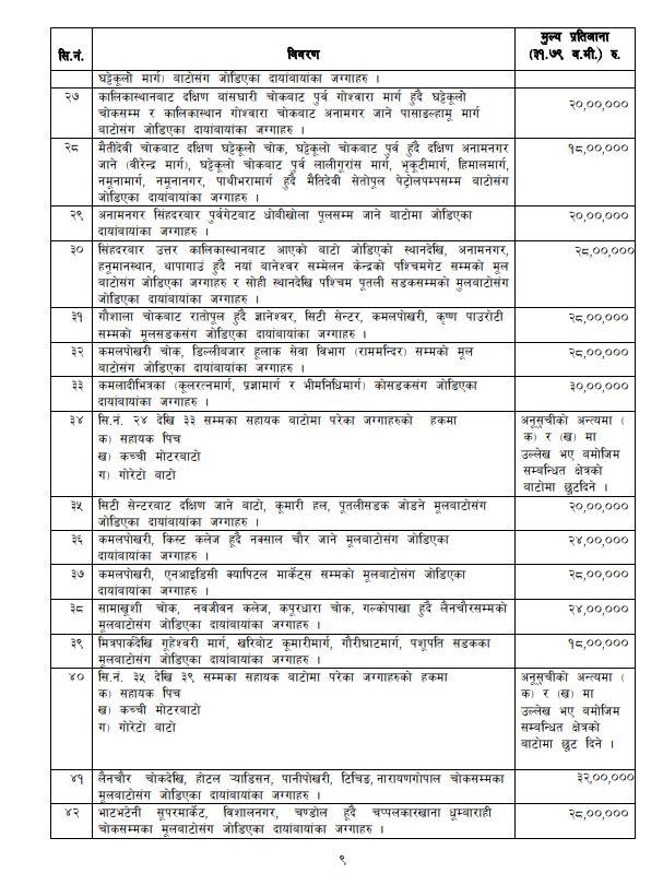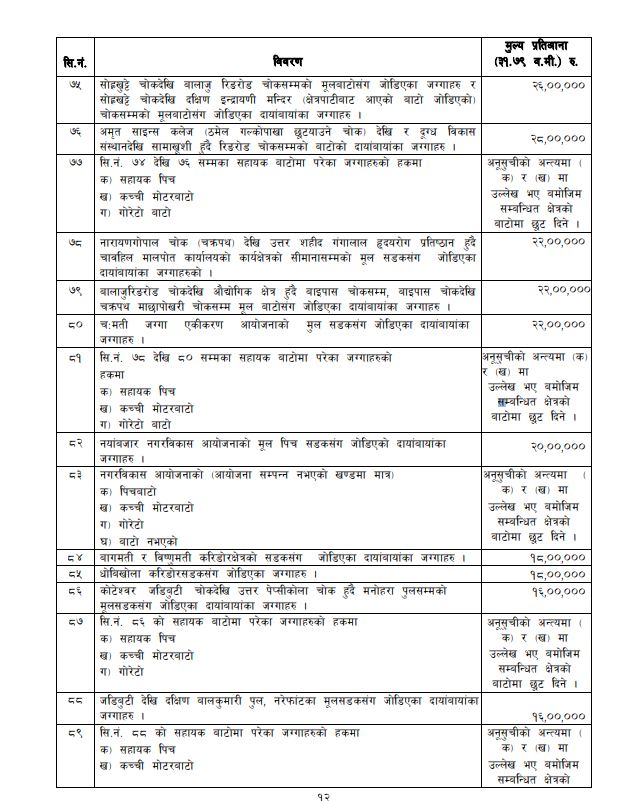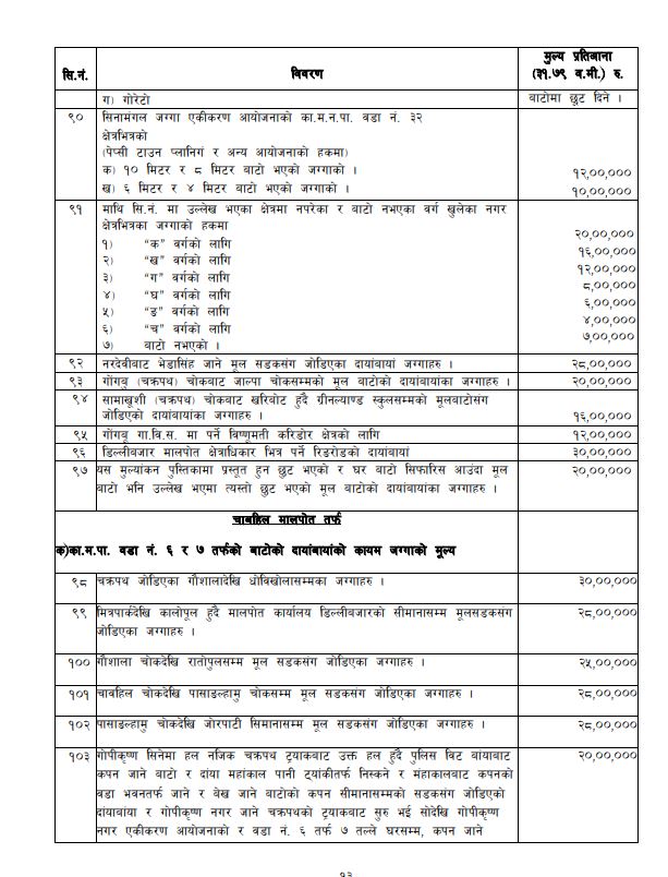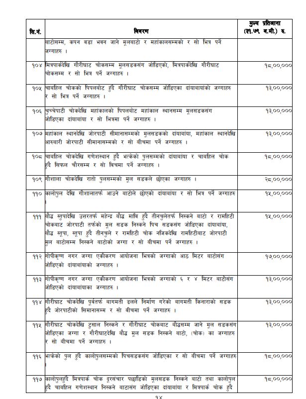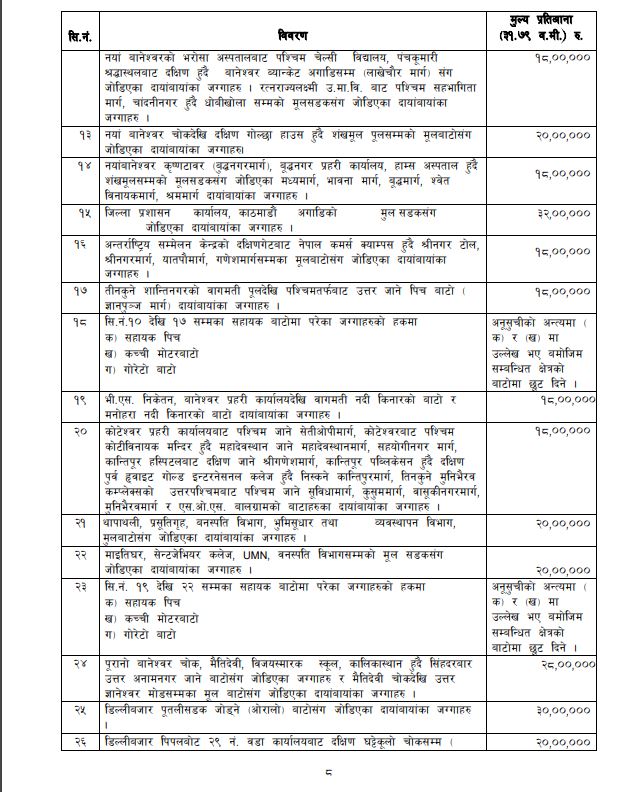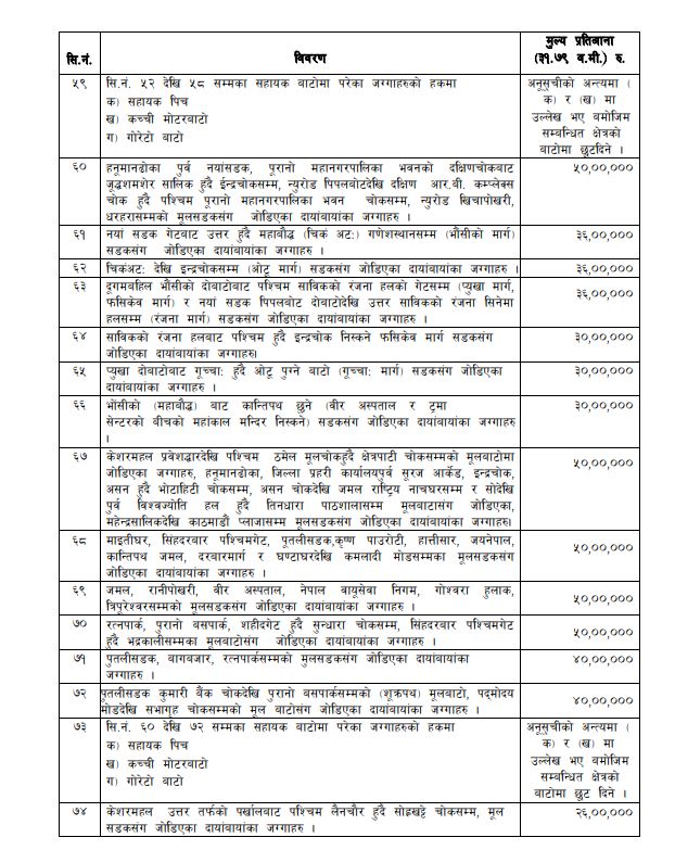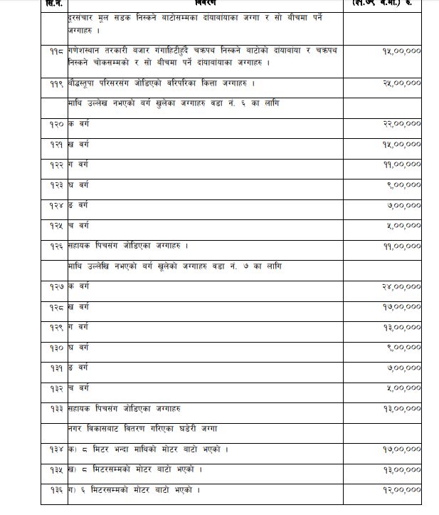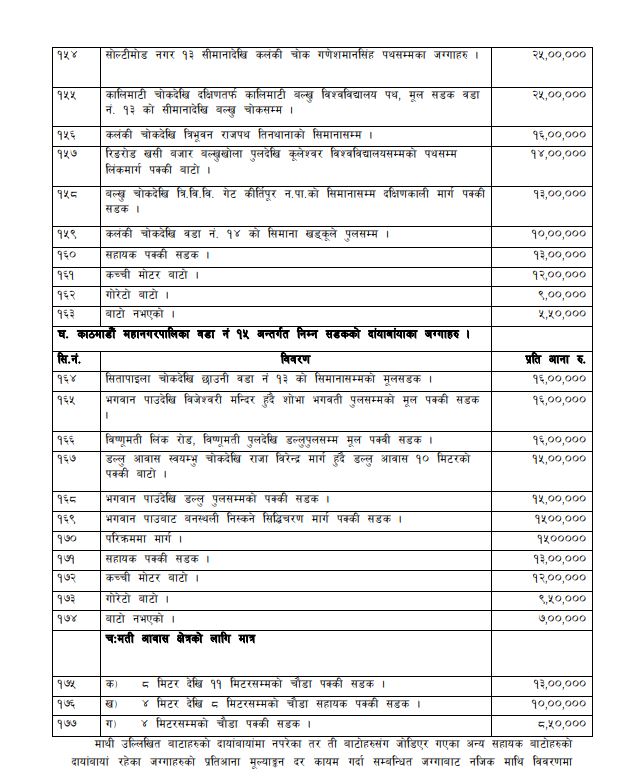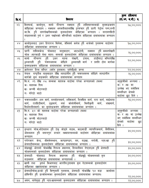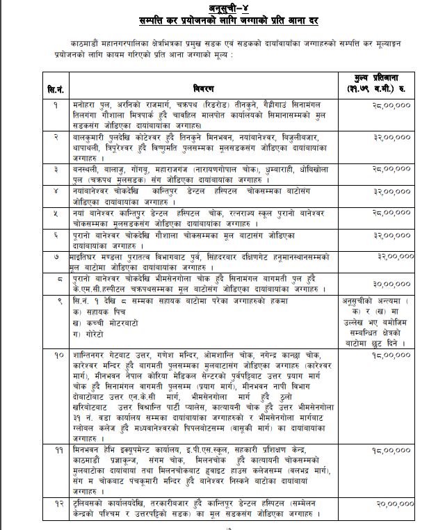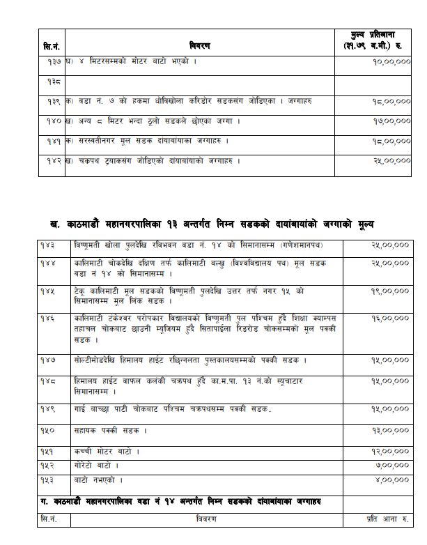 काठमाडौं महानगरपालिकाले अधिकांश जग्गाको मूल्य २६ लाख देखि ३६ लाख रुपैयाँसम्म तोकिएको छ । चक्रपथका विभिन्न स्थानको मूल्य २८ लाख देखि ३२ लाख रुपैयाँ तोकिएको छ । महाराजगन्ज, धुम्बाराही, गोगँबु, बनस्थलीको जग्गाको मूल्य २८ लाख प्रति आना तोकिएको छ । त्यस्तै, महानगरपालिकाको वडा नं १३ अन्तर्गतका विभिन्न जग्गाहरु प्रतिआना चार लाख देखि २५ लाखसम्म मूल्य तोकिएको छ । बाटो नभएका जग्गाको मूल्य प्रति आना चार लाख तोकिएको छ । गोरेटो बाटो भएका जग्गाहरु प्रतिआना छ लाख रुपैयाँ, कच्ची मोटरबाटो भएका जग्गाहरु प्रतिआना १२ लाख रुपैयाँ, पक्की सहायक सडक आसपासका जग्गाहरु प्रतिआना १३ लाख रुपैयाँ, विष्णुपति खोला पुलदेखि सोल्टीमोडसम्मका जग्गाहरु प्रतिआना २५ लाख रुपैयाँ मूल्य तोकिएको छ ।