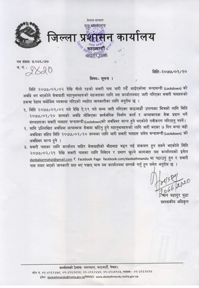 प्रशासन कार्यालय काठमाडौंले यसअघि जेठ २० सम्मका लागि जारी पास लकडाउनभर मान्य हुने जानकारी दिएको हो । जिल्ला प्रशासन कार्यालय काठमाडौंले मंगलबार एक सूचना जारी गर्दै यस्तो जानकारी दिएको हो।