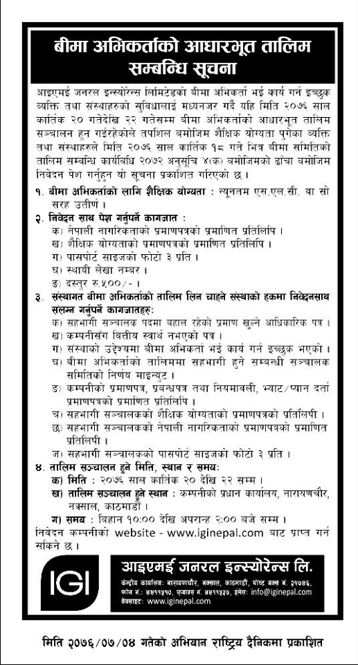 इन्स्योरेन्सले उक्त तालिम केन्द्रिय कार्यालय, नारायणचौर, नक्साल, काठमाडौंमा संचालन गर्न लागेको हो । उक्त तालिम कात्तिक २० गतेदेखि कात्तिक २२ गतेसम्म संचालन गर्ने जनाएको छ । तालिम शुल्क ५ सय रुपैयाँ लाग्ने कम्पनीले जनाएको छ ।