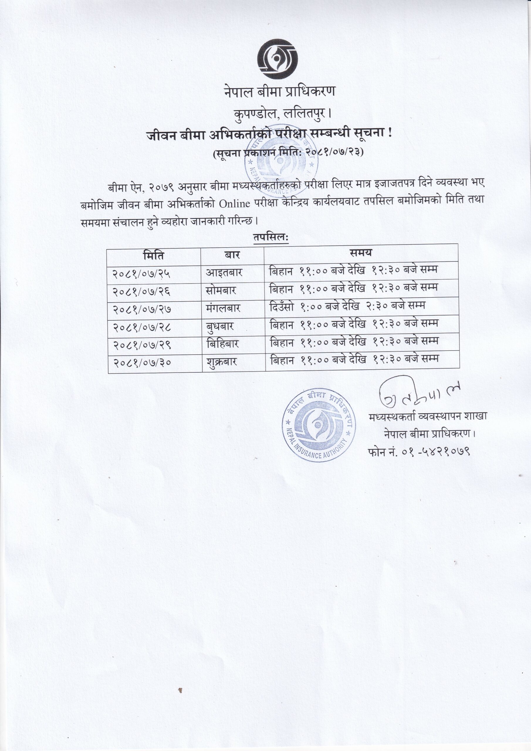 काठमाडौं । नेपाल बीमा प्राधिकरणले यही कात्तिक २५गतेबाट जीवन बीमा अभिकर्ताको अनलाइन परीक्षा संचालन गर्ने भएको छ । प्राधिकरणले बीमा ऐन २०७९ अनुसार जीवन बीमा मध्यस्थकर्ताहरुको परीक्षा लिएरमात्रै इजाजत दिने व्यवस्था भएबमोजिम जीवन बीमा अभिकर्ताको कात्तिक २५ गते आइतबारबाट हुने अनलाइन परीक्षाको समय तालिका सार्वजनिक गरेको हो ।