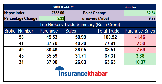 बजारमा ९ अर्ब ७७ करोड कारोबार भएको दिन ब्रोकर नम्बर ५८ बाट सर्वाधिक रकमको कारोबार भएको छ। ब्रोकर नम्बर ५८ बाट १ अर्ब ५२ लाख रुपैयाँको कारोबार भएको छ। जसमा ४९ करोड ५३ लाख रुपैयाँको खरिद भएको छ भने ५० करोड ९९ लाख रुपैयाँको बिक्री छ।