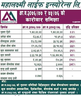 काठमान्डौ । महालक्ष्मी लाईफ इन्स्योरेन्सले आर्थिक वर्ष ७६/७७ को चौथो त्रैमासको वित्तीय विवरण प्रकाशन गरेको छ ।
