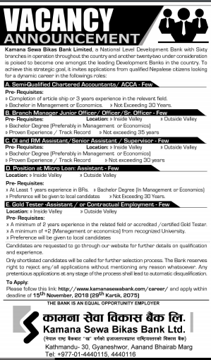 कामना सेवा विकास बैंक लिमिटेडले विभिन्न पदका लागि कर्मचारीको माग गरेको छ ।