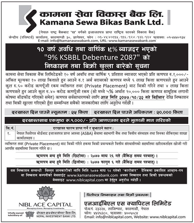 काठमाडौँ । कामना सेवा विकास बैंक लिमिटेडले आजबाट एक अर्ब रुपैयाँ बराबरको १० लाख कित्ता ऋणपत्र निष्काशन तथा बिक्री खुला गरेको छ । जसमध्ये बैंकले सर्वसाधारणका लागि ४ लाख कित्ता र व्यक्तिगत रुपमा विभिन्न संघ संस्थालाई ६ लाख कित्ता बिक्री गर्नेछ ।