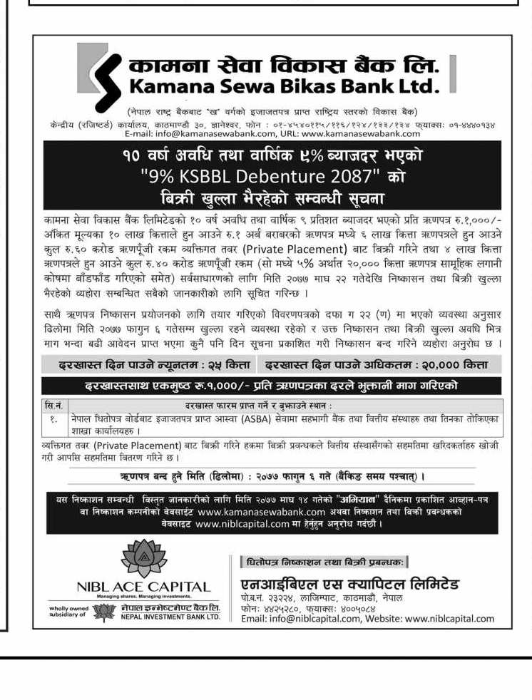 काठमाडौं । कामना सेवा विकास बैंक लिमिटेडको ऋणपत्रमा आवेदन दिने आज अन्तिम दिन रहेको छ । बैंकले माघ २२ गते, बिहीबारबाट एक अर्ब रुपैयाँ बराबरको १० लाख कित्ता ऋणपत्र धमाधम बिक्री गरिरहेको छ । जसमध्ये बैंकले सर्वसाधारणका लागि ४ लाख कित्ता र व्यक्तिगत रुपमा विभिन्न संघ संस्थालाई ६ लाख कित्ता बिक्री गर्नेछ ।