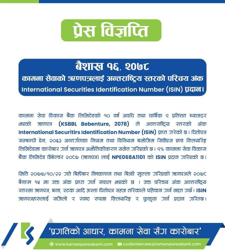 ९ प्रतिशत कामना सेवा विकास बैंक लिमिटेड डिबेन्चर २०८७ (ऋणपत्र) लाई NPE068A1101 को अन्तराष्ट्रिय स्तरको आइएसआइएन प्रदान गरिएको बैंकले जनाएको छ ।