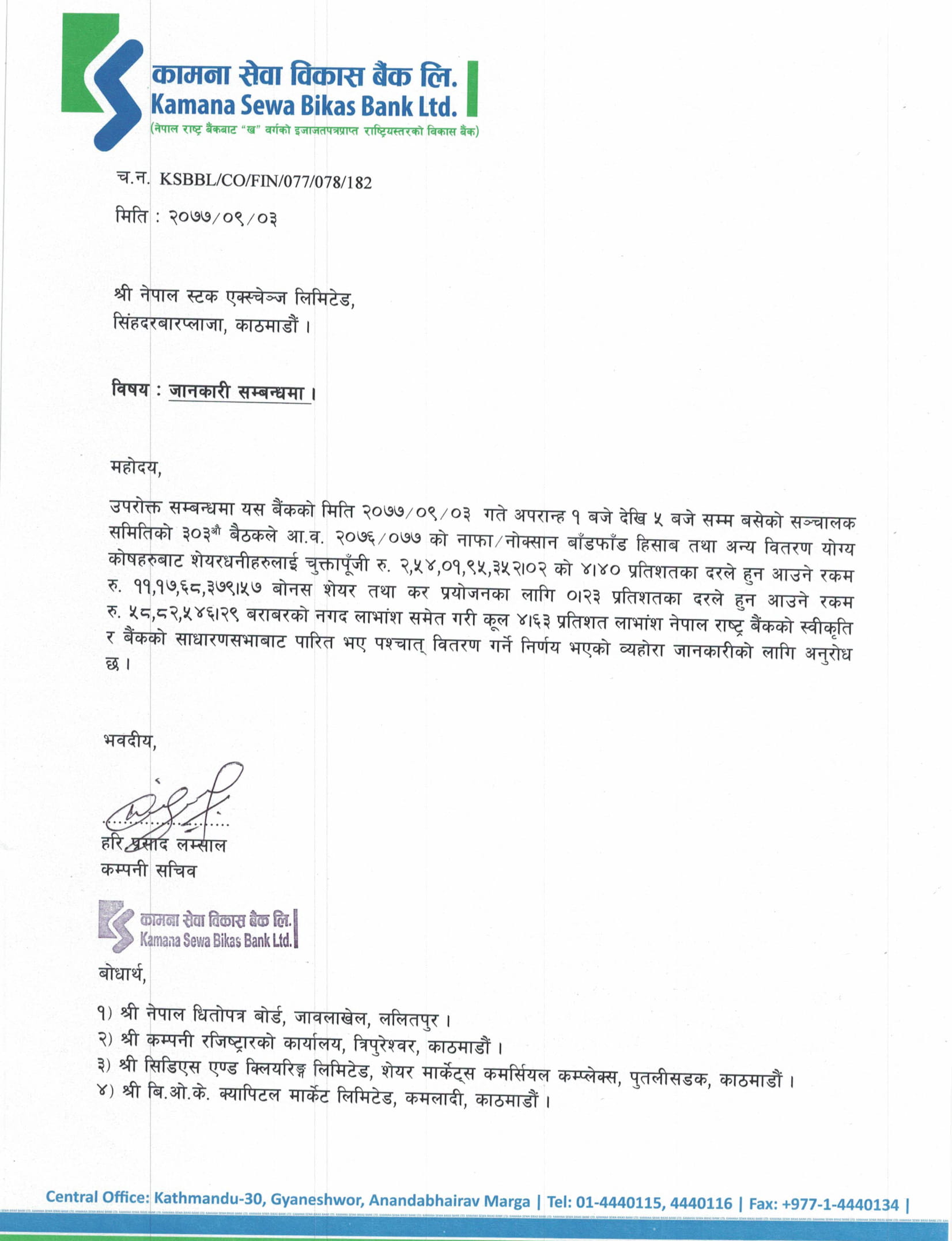 उक्त प्रस्तावित लाभांश नेपाल राष्ट्र बैंक र बैंकको आगामी वार्षिक साधारण सभाले अनुमोदन गरेपछि वितरण गरिनेछ ।
