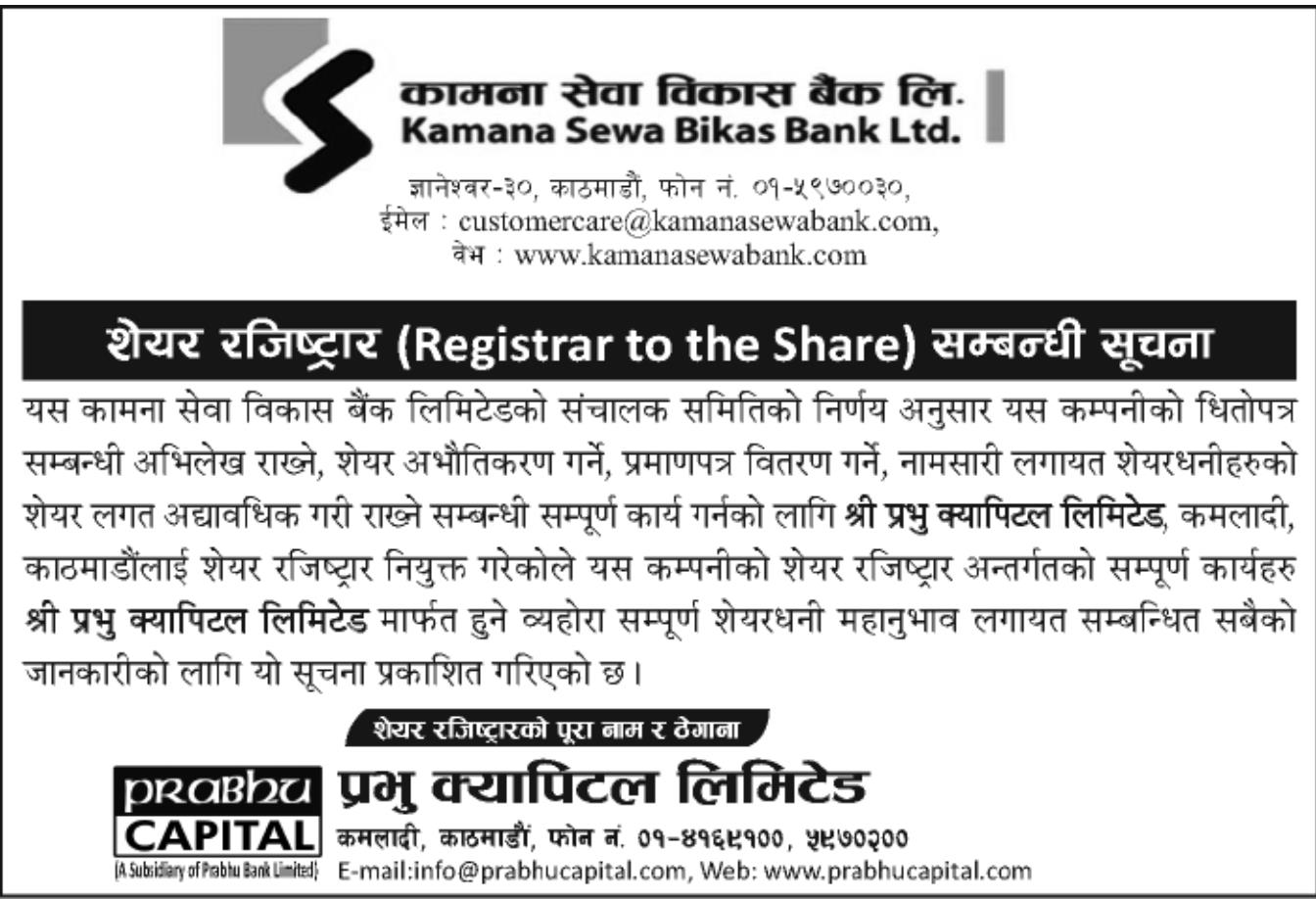 काठमाडौं । कामना सेवा विकास बैंकको शेयर रजिष्ट्रारमा प्रभु क्यापिटल लिमिटेड नियुक्त भएको छ । कम्पनीको सञ्चालक समितीको निर्णय अनुसार शेयर रजिष्ट्रारमा प्रभु क्यापिटललाई नियुक्त गर्ने निर्णय गरेको हो । अब कम्पनीको सम्पूर्ण धितोपत्र सम्बन्धी अभिलेखा राख्ने, शेयर अभौतिकीकरण गर्ने, नामसारी लगायतका कार्यहरु प्रभु क्यापिटल मार्फत हुनेछन् ।