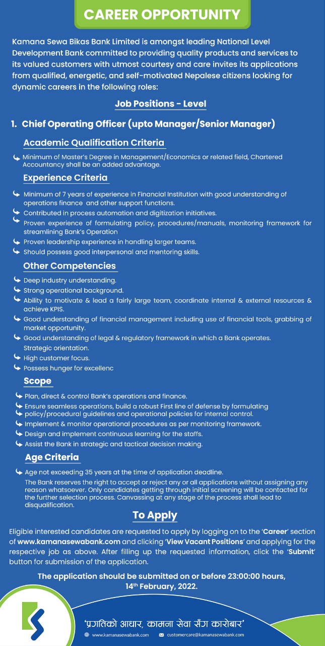 काठमाडौं । कामना सेवा विकास बैंकले कर्मचारकिो माग गरेको छ । बै.कले हेड स्ट्रायाटिजी सपोर्ट यूनिटका लागि केही संख्यामा कर्मचारीको माग गरेको छ । बैंकले म्यानेजमेन्ट तथा अर्थशास्त्रमा स्नाकोत्तर गरेको हुनुपर्ने जनाएको छ । बैंकले आफ्नो कार्यालय तथा विभिन्न शाखा कार्यालयका लागि कर्मचारीको माग गरेको हो । ईच्छुक तथा योग्यता पुगेकाले फागुन २ गतेभित्र आवेदन दिनुपर्नेछ ।