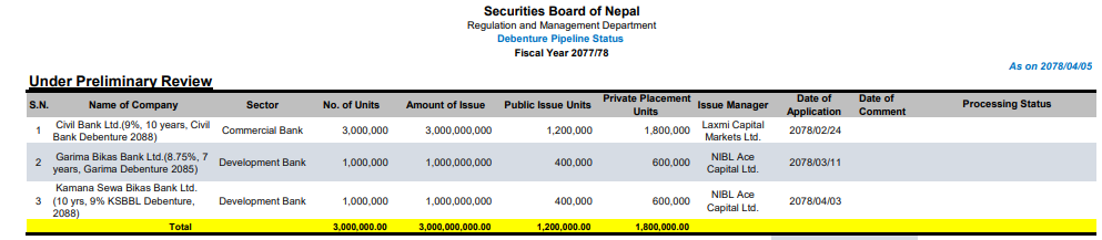 काठमाडौं । कामना सेवा विकास बैंकले ऋणपत्र निष्काशन तथा विक्रीका लागि नियामक निकाय नेपाल धितोपत्र बोर्डमा निवेदन दिएको छ । बैकले १ अर्ब बराबरको १० लाख कित्ता ऋणपत्र निष्काशन तथा विक्रीका लागि धितोपत्र बोर्डमा निवेदन दिएको हो । बेंकले बोर्डमा साउन ३ गते निवेदन दिएको हो ।