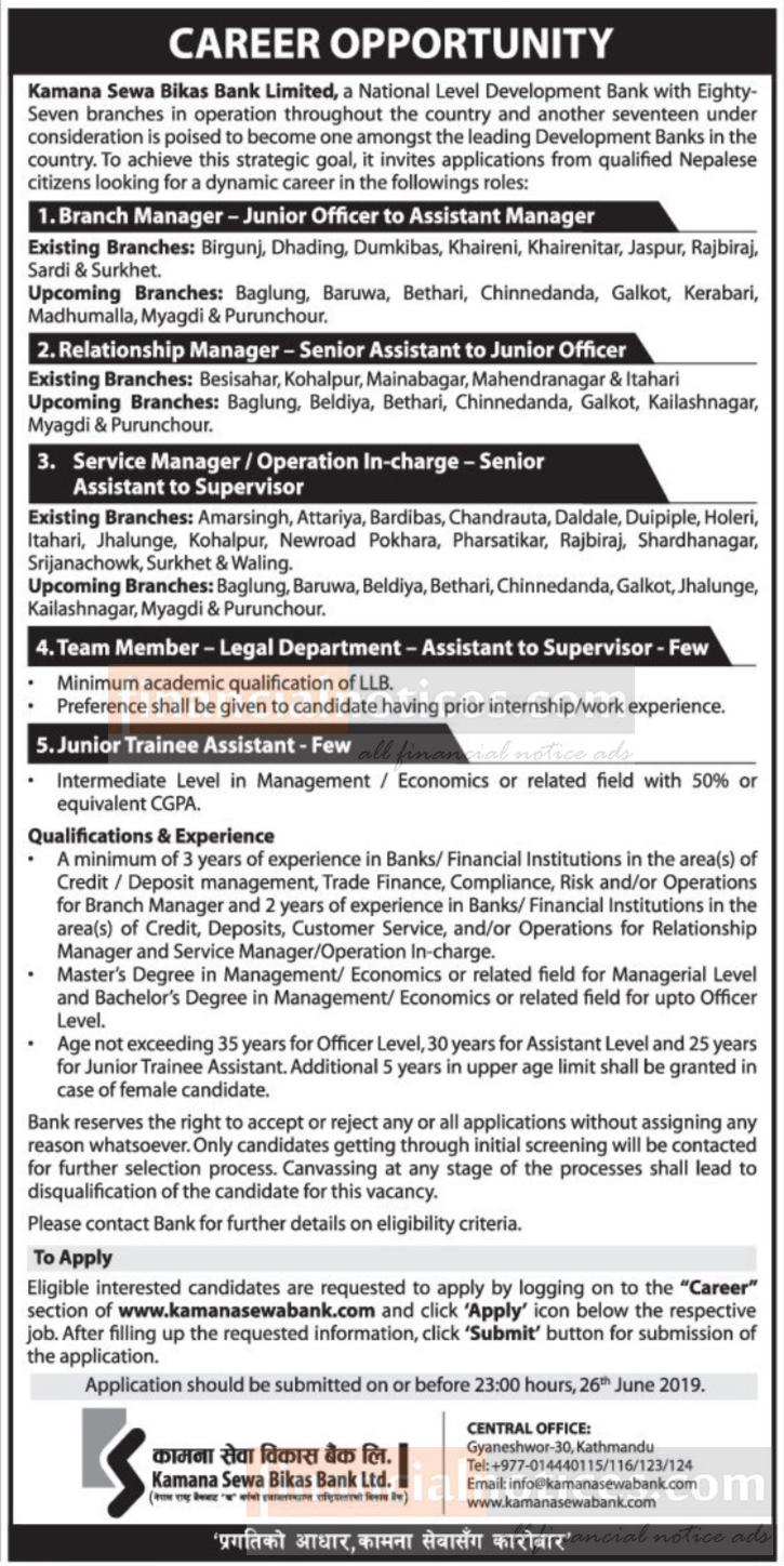 कामना सेवा विकास बैंकले विभिन्न पदमा कर्मचारी माग गरेको छ । बैंकले ब्राञ्च म्यानेजर, रिलेशनसिप म्यानेजर, सर्भिस म्यानेजर, टिम मेम्बर, जुनियर एसिस्टेन्ट पदमा कर्मचारी माग गरेको हो ।