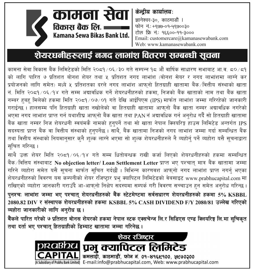 काठमाडौं । कामना सेवा विकास बैंक लिमिटेडले ५ प्रतिशत नगद लाभांश वितरण गरेको छ । कम्पनीले असोज ३० गते सम्पन्न १८औं वार्षिक साधारण सभाबाट पारित नगद लाभांश कात्तिक १ गतेदेखि सम्बन्धित शेयरधनीहरुको हितग्राही खातामा उल्लेख बैंक खातामा जम्मा गर्न सुरु गरेको जनाएको छ ।