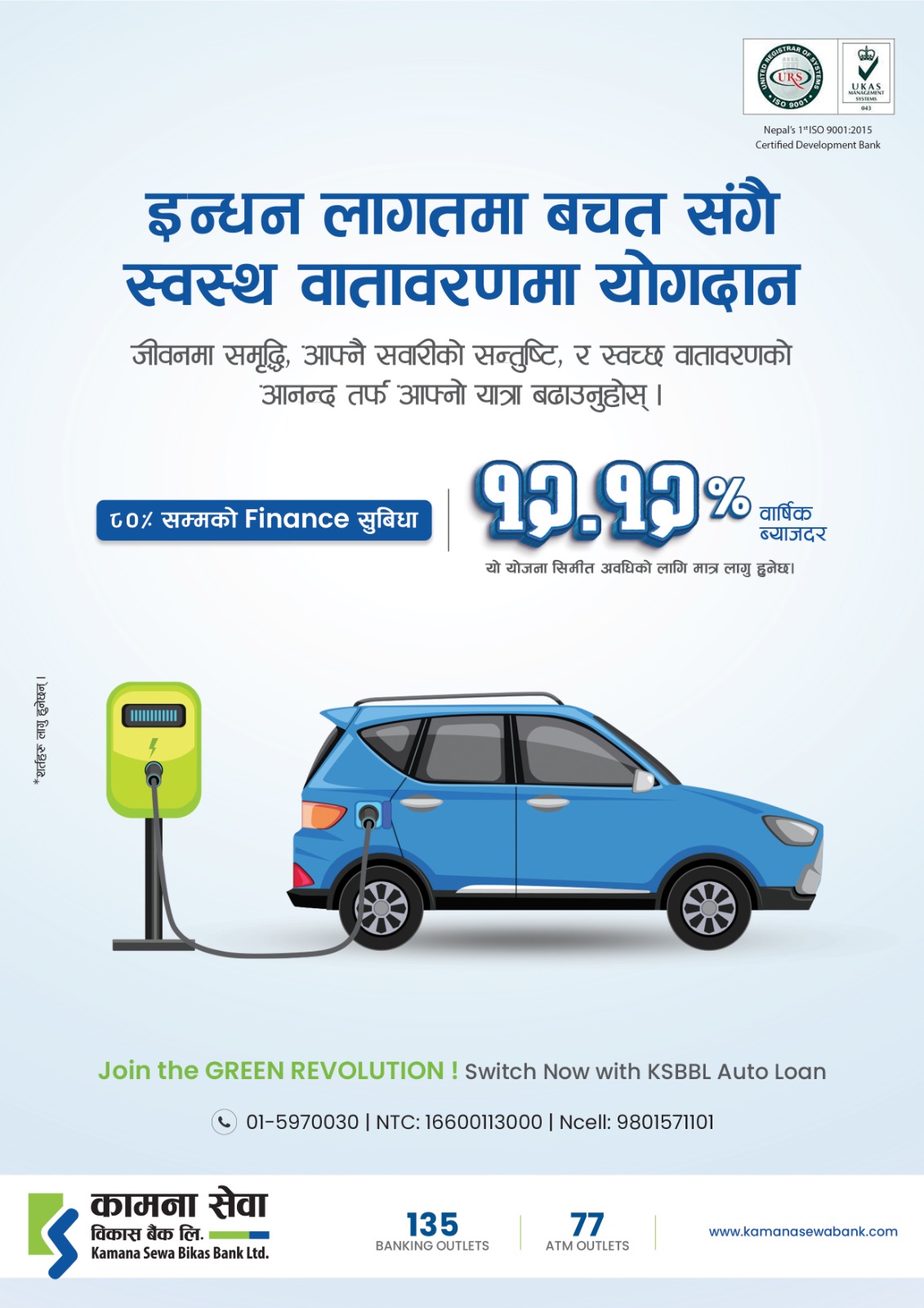 त्यस्तै गरि विद्युतिय सवारी साधन खरिदमा खरिद मुल्यको ८० प्रतिशत सम्म कर्जा उपलव्ध हुने वैंकका नायव प्रमुख कार्यकारी अधिकृत विनय दाहालले वताउनुभयो । नायव प्रमुख कार्यकारी अधिकृत दाहालका अनुसार वैंकले प्रवाह गर्ने यस्ता कर्जाहरु सम्पुर्ण कागजात पेश गरेको ३ दिन भित्रै स्वीकृत गरिसक्ने छ ।
