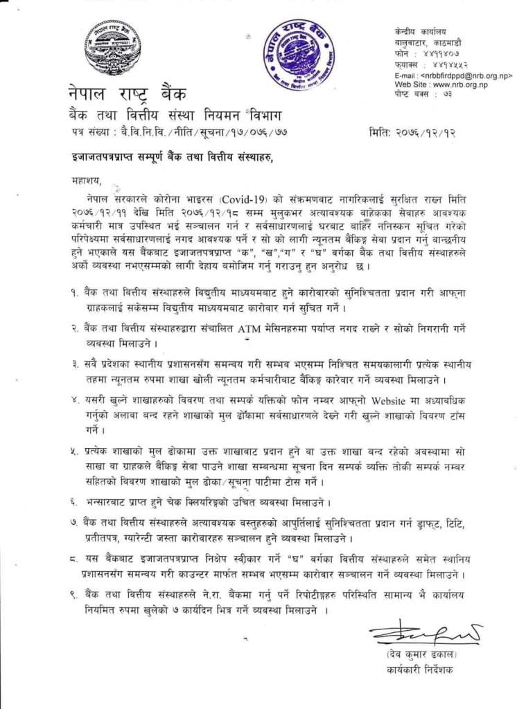त्यसैगरी नागरिकलाई आबश्यक पर्ने नगद र न्यूनतम बैंकिङ सेवा प्रदान गर्न भन्दै विद्युतीय माध्ययमबाट हुने कारोवारलाई जोड दिन र एटीएममा प्रयाप्त रकम जम्मा गर्न भनिएको छ । यसबाहेक भन्सारबाट प्राप्त हुने चेक क्लियरिङको व्यवस्था मिलाउन एवं अत्यावश्यक बस्तुहरुको आपूर्तिलाई सुनिश्चितता प्रदान गर्न तथा ड्राफ्ट, टिटि, प्रतीतपत्र, ग्यारेन्टी जस्ता कारोबारहरु सञ्चालन गर्न निर्देशन दिइएको छ ।