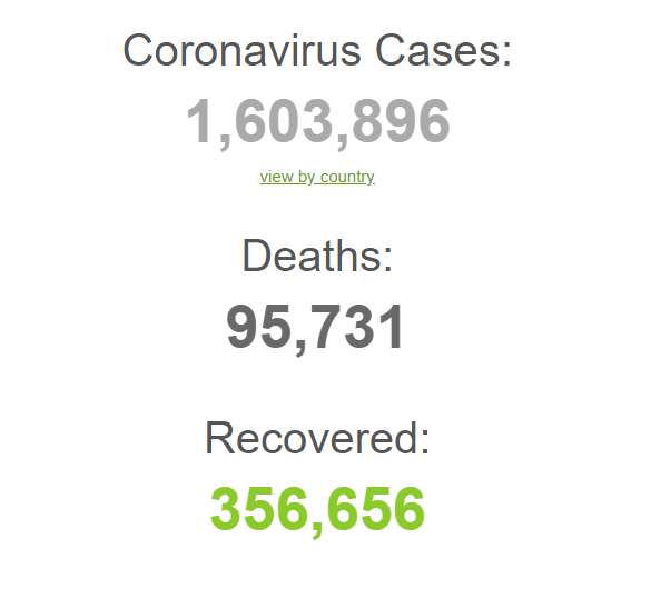 काठमाडौं । विश्वभर फैलिएको कोरोना भाइरसबाट संक्रमित हुनेको संख्या १६ लाख ३ हजार भन्दा बढी पुगसकेको छ । जसमा ९५ हजारभन्दा बढीको मृत्यु भइसकेको छ भने कूल संक्रमितमध्ये ३ लाख ५६ हजार भन्दा बढि उपचारपछि घर फर्केका छन् ।