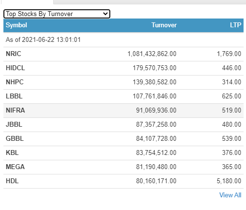 कारोबार शुरु भएको २ घण्टामा २१३ वटा कम्पनीको ९८ लाख १३ हजार ९ सय ९६ कित्ता शेयर किनबेच हुँदा ५ अर्ब ३९ करोड ५१ लाख रुपैयाँको शेयर कारोबार हुँदा सबैभन्दा धेरै पुनर्बीमा कम्पनीको कारोबार भएको छ । कम्पनीको शेयर लगातार सर्वाधिक कारोबार हुँदै आएको थियो ।