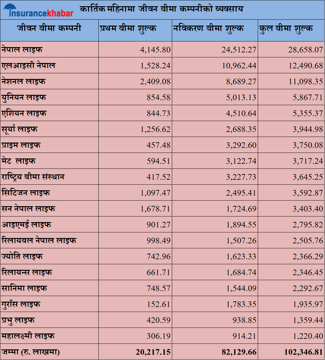 कार्तिक महिनामा सबैभन्दा धेरै नेपाल लाइफले २ अर्ब ८६ करोड रुपैयाँ बीमा शुल्क आर्जन गरेको छ । जस मध्ये नविकरणकै हिस्सा २ अर्ब २४ करोड छ भने प्रथम जम्मा ४ करोड १४ लाख मात्रै छ । त्यस्तै दोस्रो स्थानमा रहेको एलआइसी नेपालले एक अर्ब २४ करोड रुपैयाँ बीमा शुल्क आर्जन गर्दा नविकरणको हिस्सा एक अर्ब ९ करोड छ भने प्रथम तर्फ १५ करोड २८ लाख मात्रै छ ।