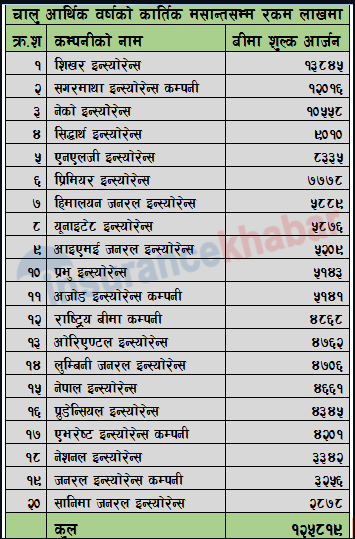 कार्तिक मसान्तसम्ममा निर्जीवन बीमा कम्पनीहरुले संकलन गरे १२ अर्ब ५८ करोड बीमा शुल्क (सूचिसहित)