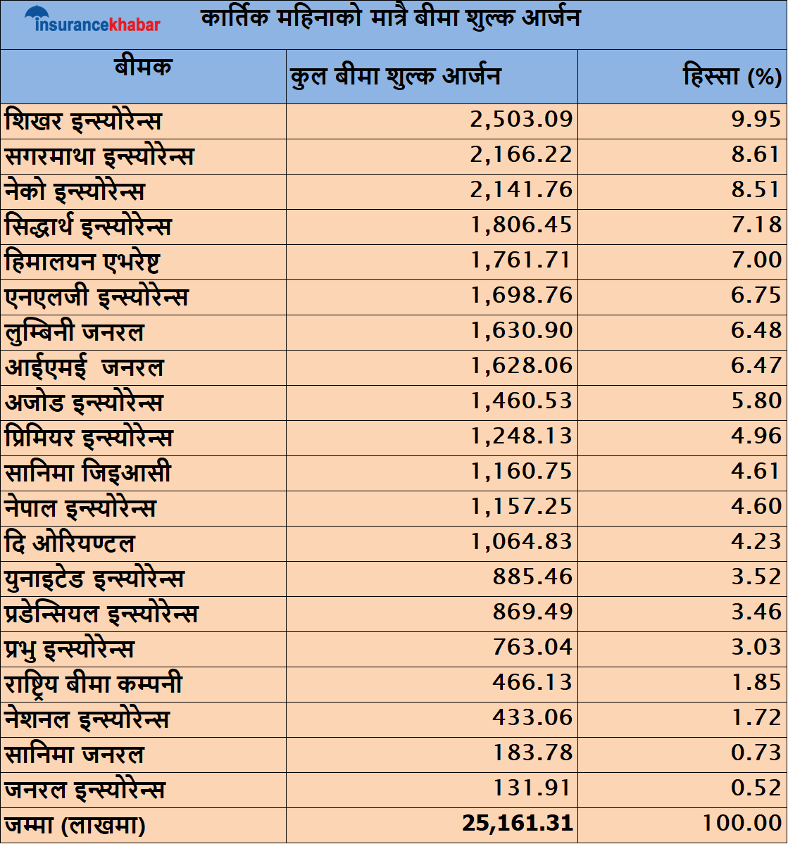 काठमाडौं । कार्तिक महिनामा मात्रै निर्जीवन बीमा कम्पनीहरु २ अर्ब ५१ करोड रुपैयाँ बीमा शुल्क आर्जन गरेका छन् । यस महिनामा सबैभन्दा धेरै शिखर इन्स्योरेन्स कम्पनीले २५ करोड तीन लाख रुपैयाँ बीमा शुल्क आर्जन गरेको छ । यस आधारमा शिखरको मात्रै बजार हिस्सा ९.९५ प्रतिशत छ ।