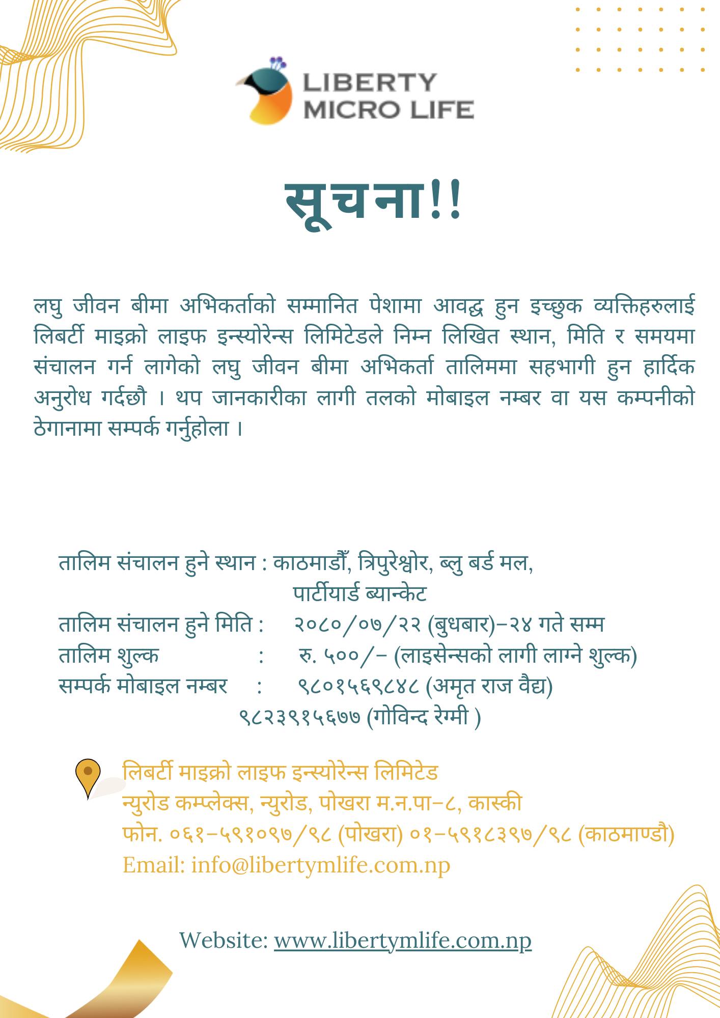 काठमाडौं । लिबर्टी माइक्रो लाइफ इन्स्योरेन्स कम्पनीले लघु जीवन बीमा अभिकर्ता तालिम संचालन गर्ने भएको छ । कम्पनीले लघु जीवन बीमा अभिकर्ता पेशामा आबद्ध हुन ईच्छुक व्यक्तिहरुका लागि तालिम संचालन गर्न लागेको हो । उक्त तालिम काठमाडौं, त्रिपुरेश्वर ब्लु बर्ड मल पार्टीयार्ड ब्यान्केटमा संचालन गर्न लागेको कम्पनीले जनाएको छ ।