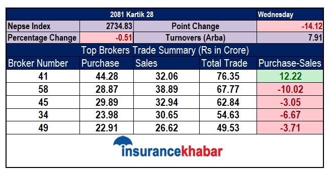 ब्रोकर नम्बर ४१ बाट ७६ करोड ३५ लाखको कारोबार भएको छ जसमा ४४ करोड २८ लाखको खरीद छ भने ३२ करोड ६ लाखको विक्री छ । त्यस्तै दोश्रोमा ब्रोकर नम्बर ५८ बाट २८ करोड ८७ लाखको खरीद छ भने ३८ करोड ८९ लाखको विक्री छ ।