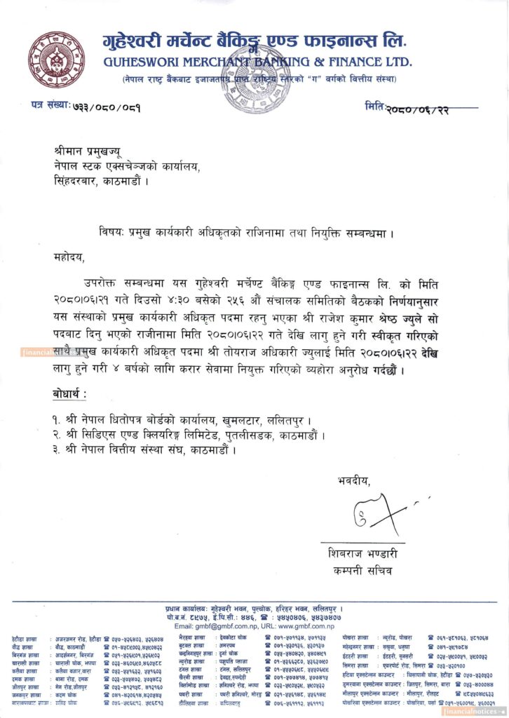 श्रेष्ठ बाहिरिएसँगै ताेयराज अधिकारीलाई गुहेश्वरी मर्चेण्टले प्रमुख कार्यकारी पदमा नियुक्त गरेकाे छ। अधिकारी वेष्ट फाइनान्स लिमिटेडमा प्रमुख कार्यकारी अधिकृत रहेका थिए ।