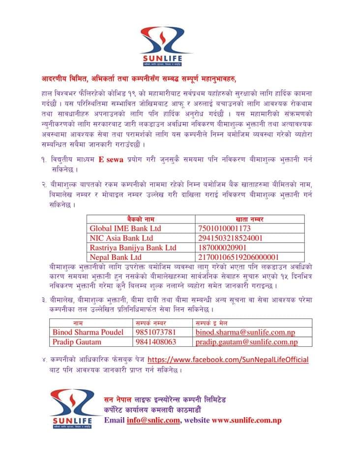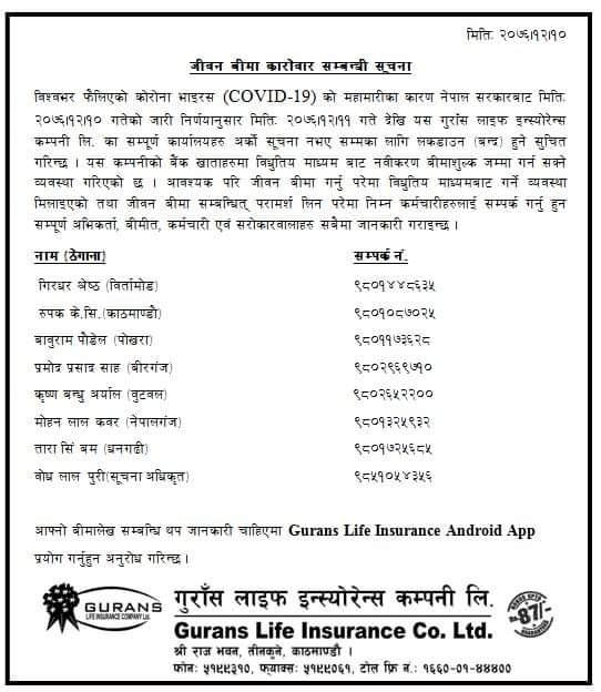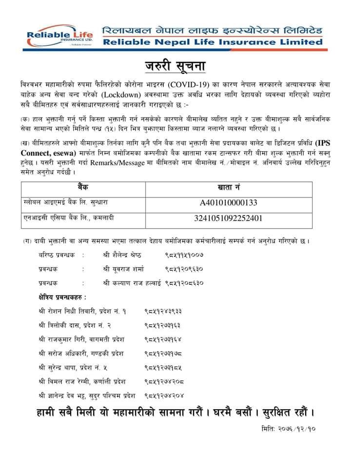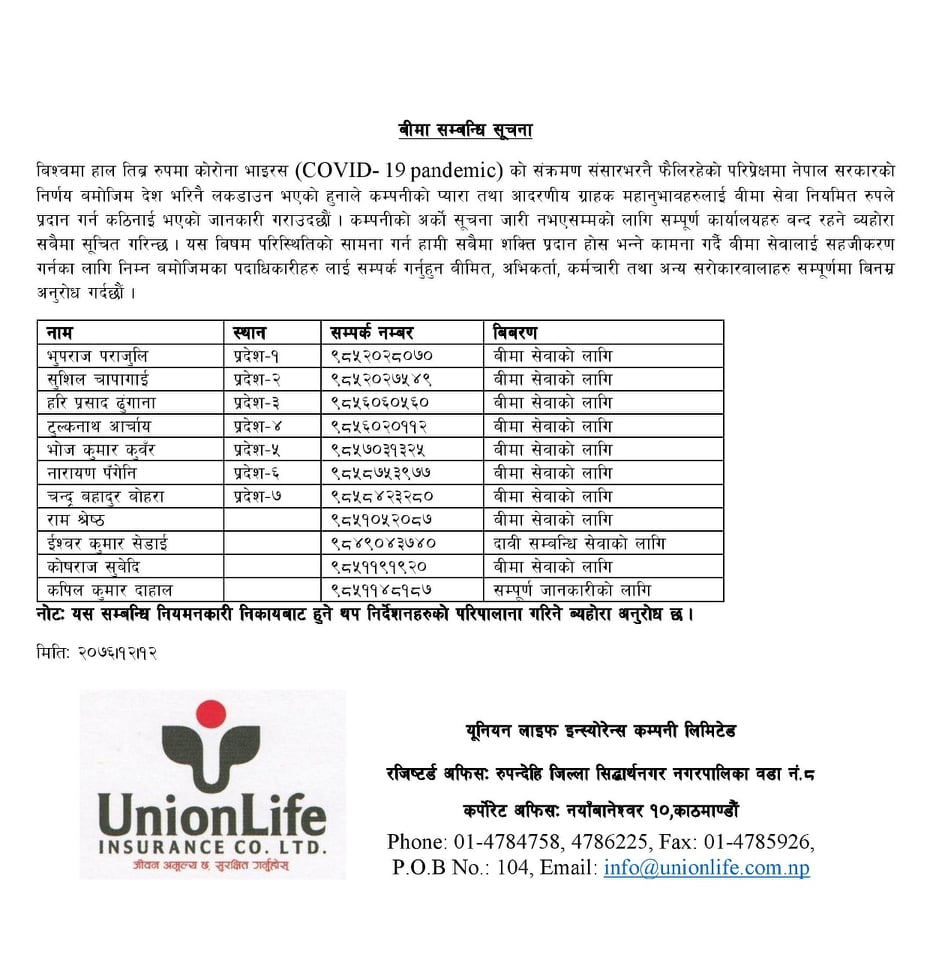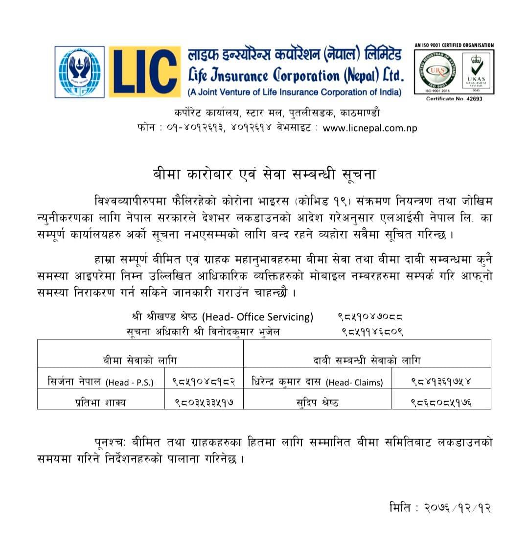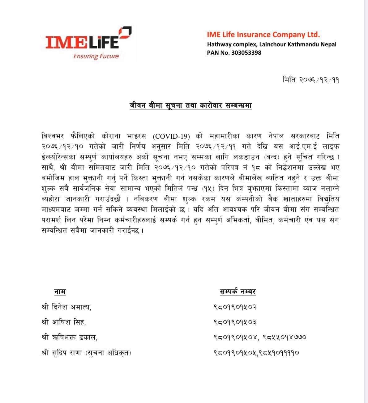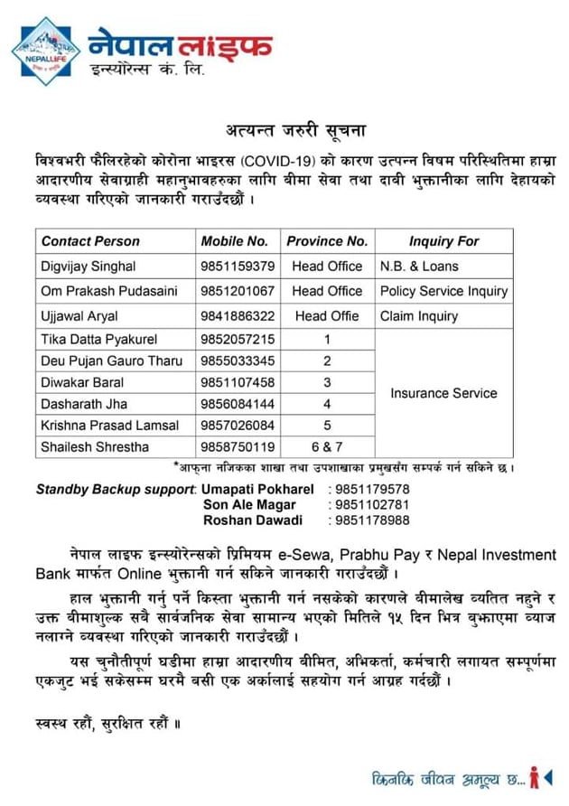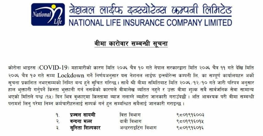 निर्जिवन तथा जीवन बीमा गर्ने कम्पनीहरुले बीमा व्यवसायको लागि फोकल पर्सन तोकेर बीमा व्यवसाय सुचारु राखेका हुन् । देश लकडाउनको अवस्थामा बीमा गर्न तथा दावी भुक्तानीको लागि छुट्टछुट्टै सम्पर्क व्यक्ति तोकेर इमेल तथा टेलिफोनमार्फत बीमा व्यवसाय गर्न सकिने ति कम्पनीहरुले जनाएका छन् ।