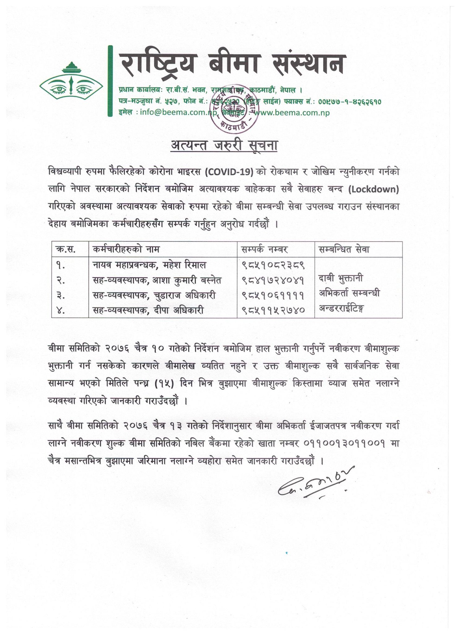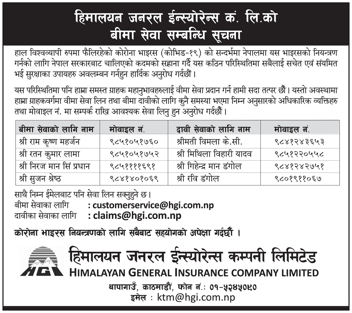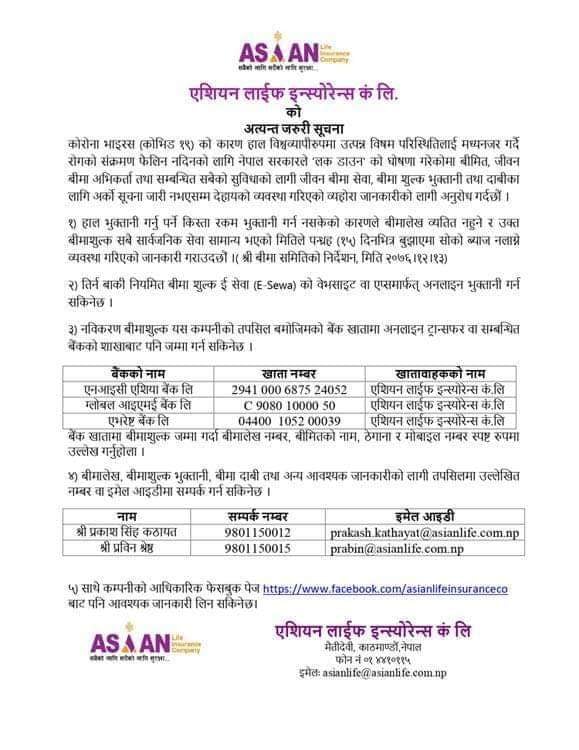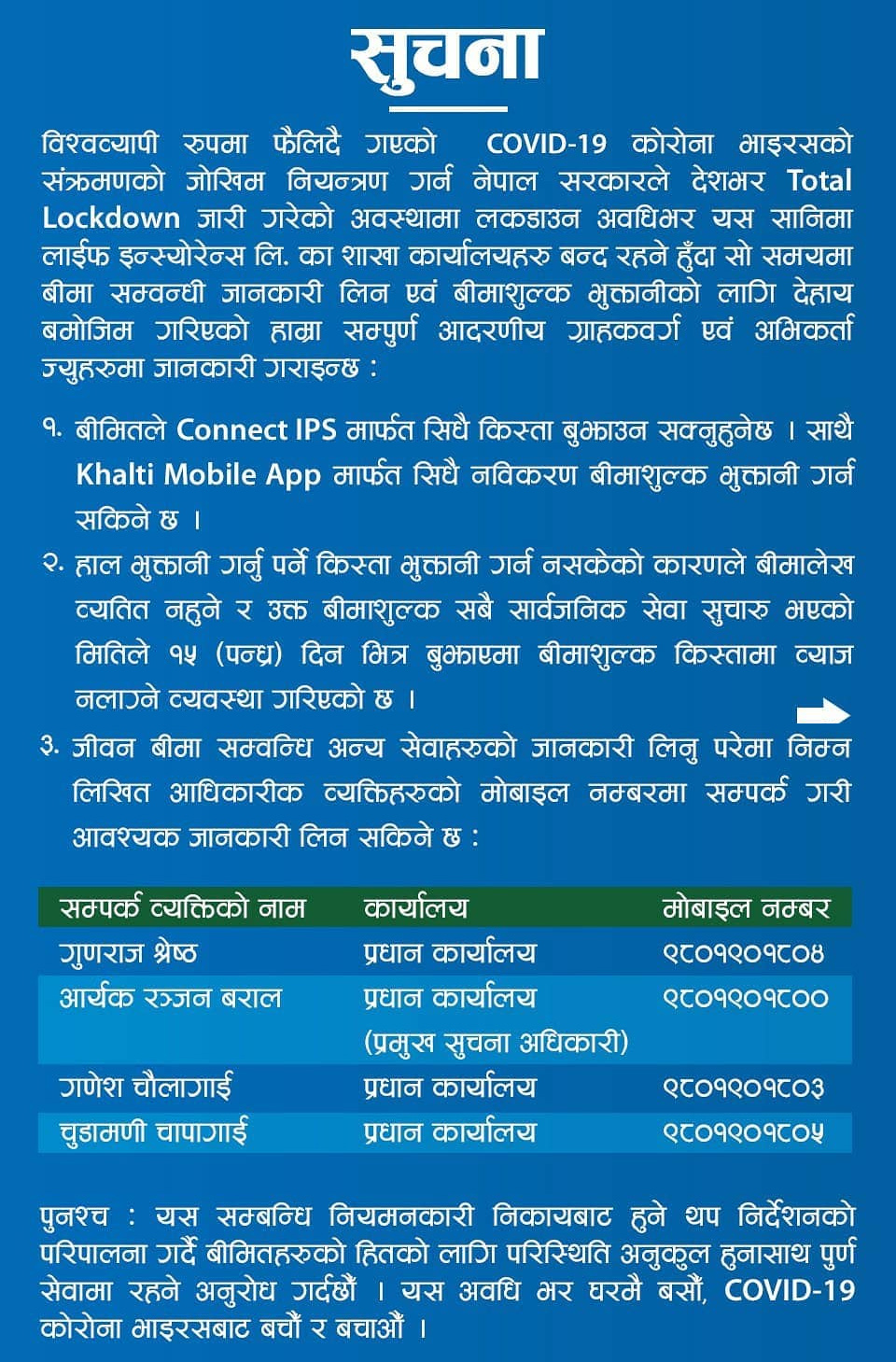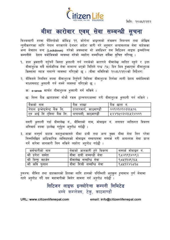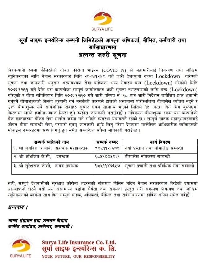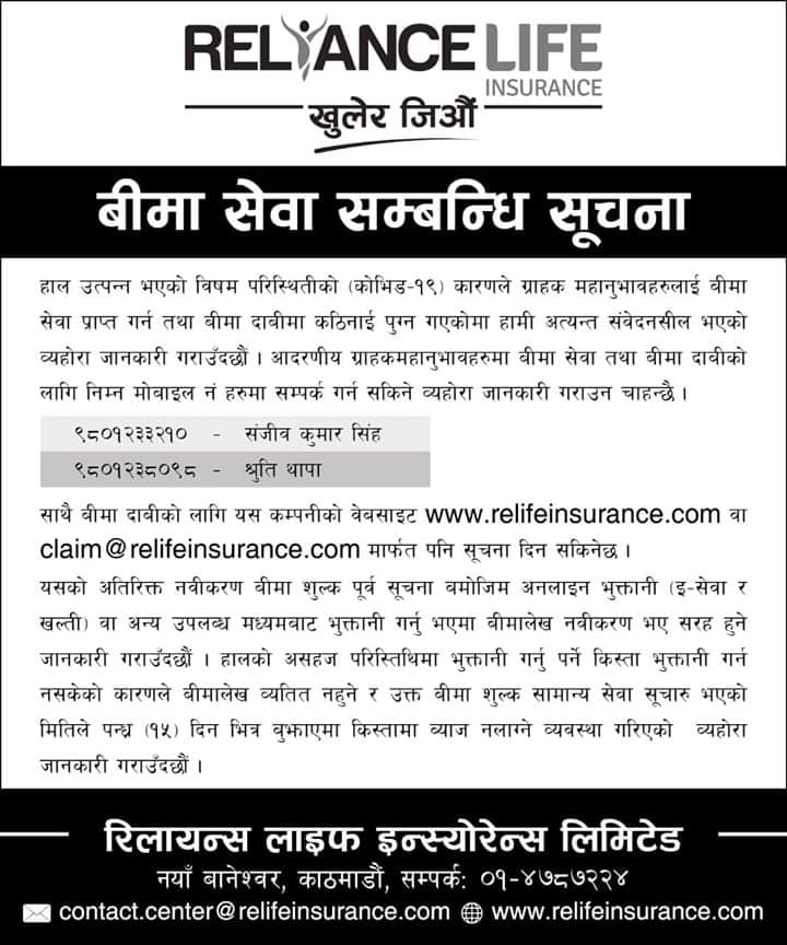 निर्जिवन तथा जीवन बीमा गर्ने कम्पनीहरुले बीमा व्यवसायको लागि फोकल पर्सन तोकेर बीमा व्यवसाय सुचारु राखेका हुन् । देश लकडाउनको अवस्थामा बीमा गर्न तथा दावी भुक्तानीको लागि छुट्टछुट्टै सम्पर्क व्यक्ति तोकेर इमेल तथा टेलिफोनमार्फत बीमा व्यवसाय गर्न सकिने ति कम्पनीहरुले जनाएका छन् ।