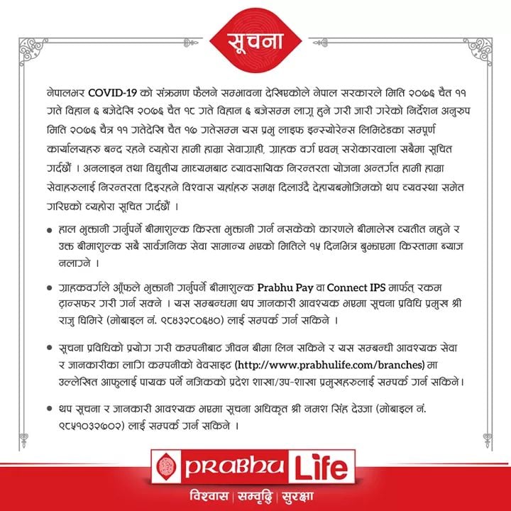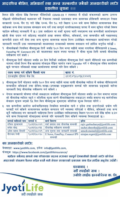 कुन कम्पनीमा कसलाई सम्पर्क गर्ने भन्ने सूचनासहित बीमा व्यवसाय सुचारु राखिएको छ ।