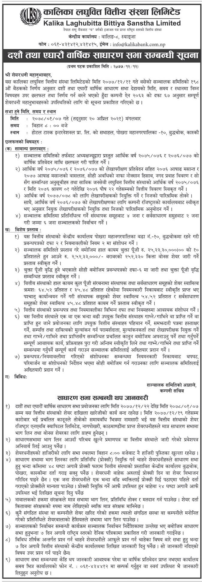 काठमाडौं । कालिका लघुवित्त वित्तीय संस्था लिमिटेडले दशौं र एघारौं वार्षिक साधारण सभा आह्वान गरेको छ । संस्थाको चैत ११ गते, बुधबार बसेको सञ्चालक समितिको बैठकले सभाको निर्णय गरेको हो ।