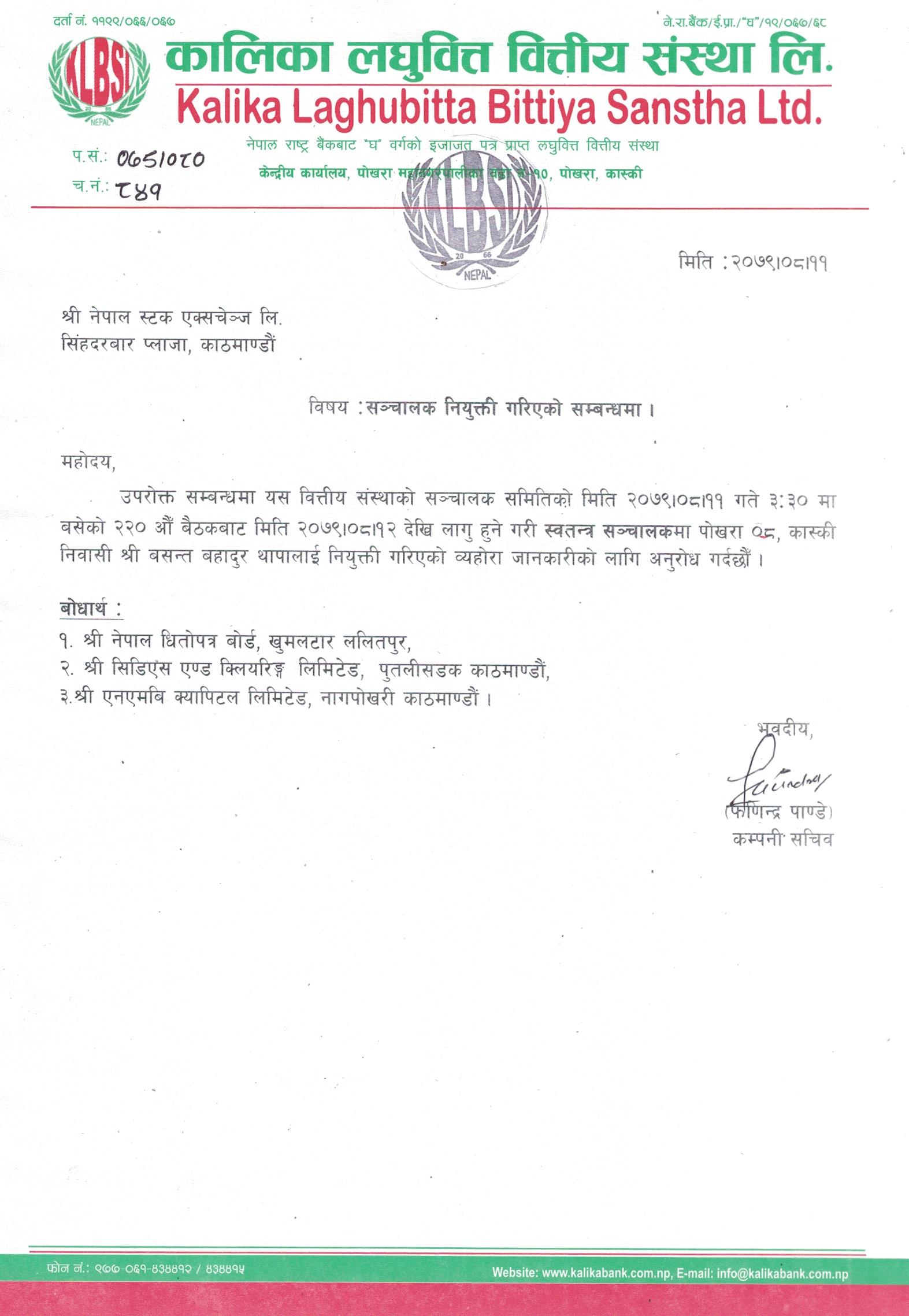 काठमाडौं । कालिका लघुवित्त वित्तीय संस्था लिमिटेडको स्वतन्त्र सञ्चालकमा बसन्त बहादुर थापा नियुक्त भएका छन् । कम्पनीको मंसिर ११ गते बसेको सञ्चालक समितिको बैठकले मंसिर १२ गते देखि लागू हुने गरेर स्वतन्त्र सञ्चालकमा थापालाई नियुक्त गरेको कम्पनीले जनाएको छ ।
