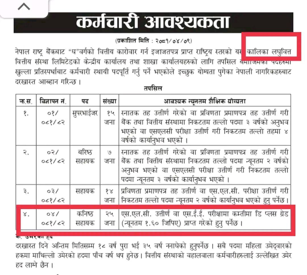 काठमाडौं । कालिका लघुवित्त वित्तीय संस्थाले कर्मचारी माग गरेको छ । कम्पनीले सुपरभाइजरका लागि १५ जना, वरिष्ठ सहायकका लागि ७ जना, सहायकका लागि १४ जना, कनिष्ठ सहायकका लागि २५ जना कर्मचारी माग गरेको छ । कम्पनीले कुल ६१ जना कर्मचारी माग गरेको हो । ईच्छुक तथा योग्यता पुगेकाले कम्पनीको इमेल ठेगानामा आवेदन दिनुपर्नेछ ।