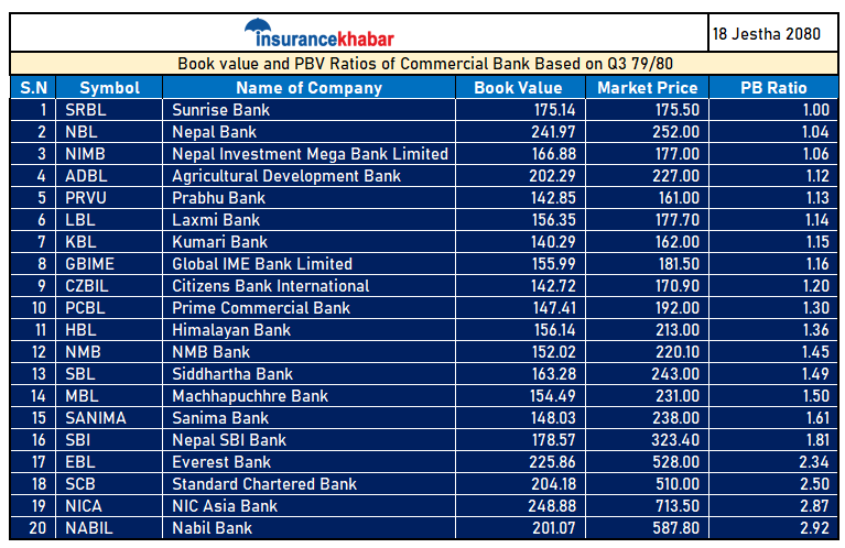 त्यस्तै नेपाल बैंकको किताबी मूल्य २४१ रुपैयाँ ९७ पैसा हुँदा कम्पनीको विहीवारको बजार मूल्य २५२ रुपैयाँ छ । कम्पनीको पीबी रेशियो १ दशमलव ०४ गुणा छ । तेश्रोमा नेपाल इन्भेष्टमेण्ट मेगा बैंकको किताबी मूल्य १६६ रुपैयाँ ८८ पैसा हुँदा कम्पनीको विहीवारको बजार मूल्य १७७ रुपैयाँ छ । कम्पनीको पीबी रेशियो १ दशमलव ०६ गुणा छ ।