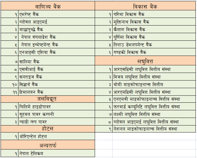सार्वजनिक सूचीमा ११ वाणिज्य बैंक, ६ वटा विकास बैंक, ९ वटा लघुवित्त, ३ वटा जलविद्युत कम्पनी, एउटा होटल र नेपाल टेलिकम परेका छन्।