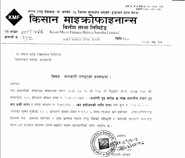 काठमाडौं । किसान माइक्रोफाइनान्स वित्तीय संस्थाले आर्थिक वर्ष २०७५ ७६ को लागि लाभांश घोषणा गरेको छ । लघुवित्तले २४ प्रतिशत बोनस सेयर र कर तिर्न १ दशमलव १४ प्रतिशत नगद लाभांश दिने भएको हो ।
