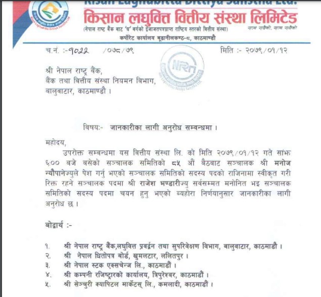 यसअघिका सञ्चालक मनोज न्यौपानेले सञ्चालक समिति सदस्यबाट दिएको राजीनामा स्वीकृत गरी रिक्त रहेको पदमा भण्डारीलाई मनोनित गरेको कम्पनीले जनाएको छ ।