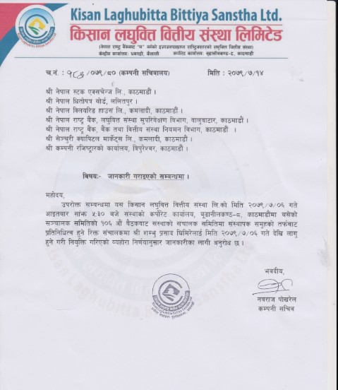 काठमाडौं । किसान लघुवित्त वित्तीय संस्थाको सञ्चालकमा शम्भुप्रसाद घिमिरे नियुक्त भएका छन् । कम्पनीले संस्थापक समूहको तर्फबाट घिमिरेलाई सञ्चालकमा नियुक्त गरेको हो ।
