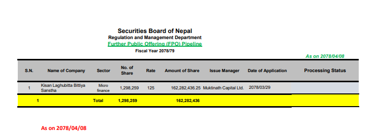 काठमाडौं । किसान लघुवित्त वित्तीय संस्थाले एफपीओ निष्काशन गर्नका लागि नियामक निकाय नेपाल धितोपत्र बोर्डमा निवेदन दिएको छ । संस्थाले १२५ रुपैयाँ दरमा १६ करोड २२ लाख ८२ हजार ४३६ दशमलव २५ बराबरको १२ लाख ९८ हजार २५९ कित्ता एफपीओ निष्काशन गर्नका लागि बोर्डमा निवेदन दिएको हो । संस्थाले बोर्डमा असार २९ गते निवेदन दिएको हो ।