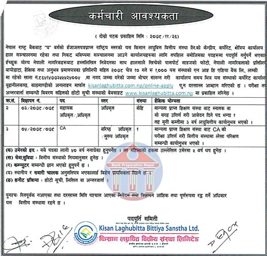 काठमाडौं । किसान लघुवित्त वित्तीय संस्था लिमिटेडले कर्मचारीको माग गरेको छ । कम्पनीलेसहायक अधिकृत र अधिकृतका लागि केही संख्यामा र सिएका लागि १ जना कर्मचारी माग गरेको हो ।