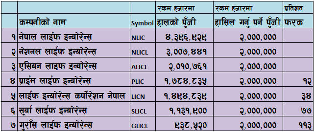 हाल नेपाली दोश्रो बजारमा ७ वटा लाईफ इन्स्योरेन्स कम्पनीका शेयर किनबेच हुने गरेका छन । जसमा तीन वटा मात्र जीवन बीमा कम्पनीले २ अर्ब पुँजीको लक्ष्य हासिल गरेका छन् ।२ अर्ब पुँजीको लक्ष्य हासिल गर्नेमा नेपाल लाईफ इन्स्योरेन्स ,नेशनल लाईफ इन्स्योरेन्स र एसियन लाईफ इन्स्योरेन्स छन् । नेपाल लाईफको पुँजी ४ अर्ब ३९ करोड छ भने नेशनल लाईफको पुँजी ३ अर्ब छ । एसियन लाईफ इन्स्योरेन्सले ६० प्रतिशत हकप्रद शेयरका लागि बुक क्लोज गरिसकेकोले कम्पनीको पुँजी २ अर्ब पुगेको छ।