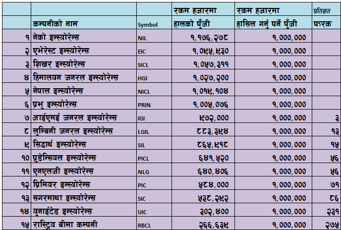 त्यस्तै युनाईटेड इन्स्योरेन्स र रास्ट्रीय बीमा कम्पनीले आफ्नो पुँजी क्रमश २३१ प्रतिशत र २७५ प्रतिशतले वृद्धि गर्नु पर्ने देखिन्छ । युनाईटेड इन्स्योरेन्सको २४० प्रतिशत हकप्रद शेयर दिने प्रक्रियामा छ । उक्त हकप्रद पश्चात इन्स्योरेन्सको चुक्ता पुँजी पुग्ने छ ।