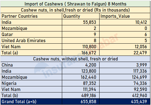 नेपालमा मोजाम्बिक, भारत, भियतनाम, चीन, कतार, नाईजेरिया र युनाईटेड अरब इमिरेट्सबाट काजु आयात भएको तथ्यांकले देखाएको छ ।